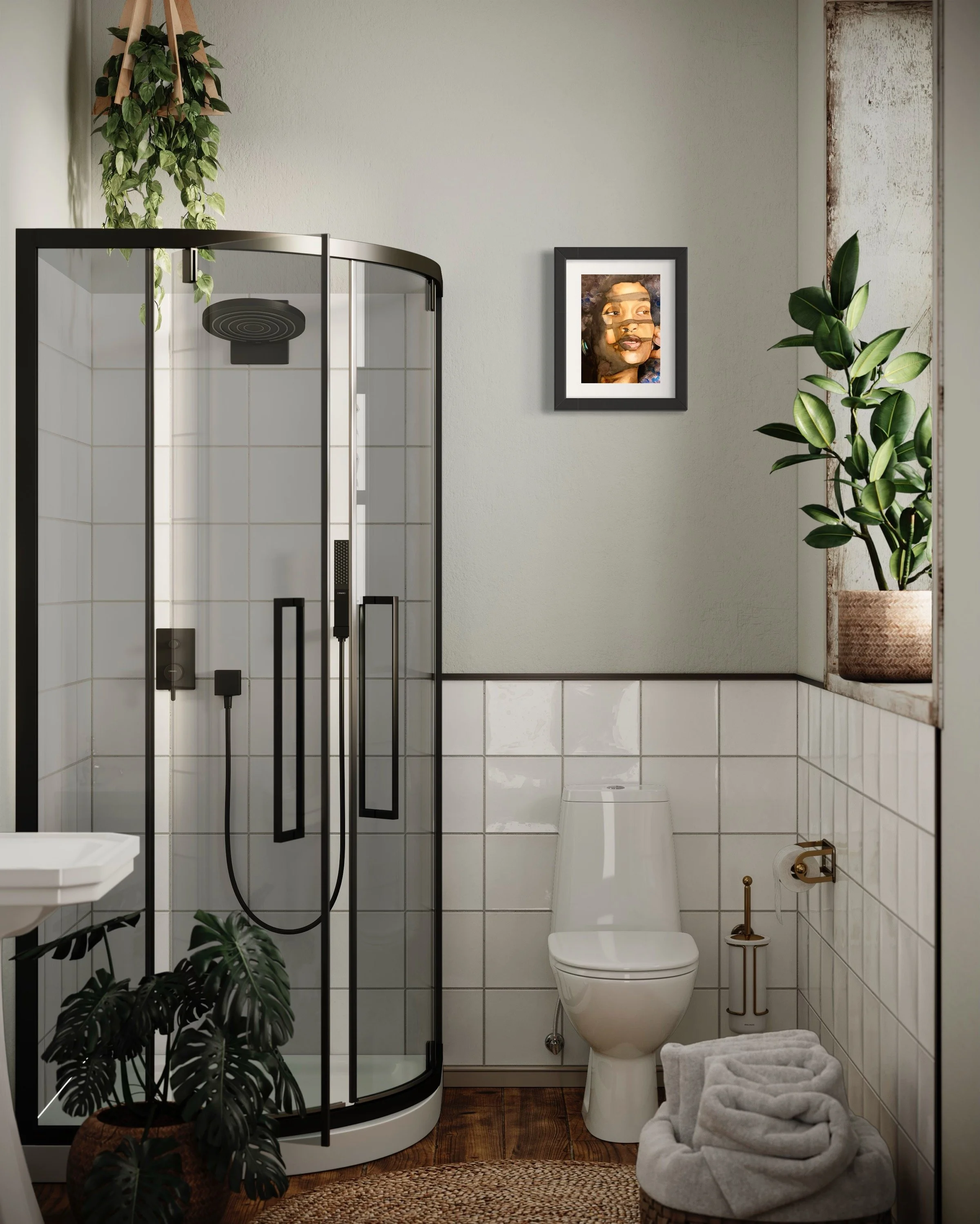 Introducing “Smile“, the enchanting painting of a lovely woman with a radiant smile! This dazzling artwork has the remarkable power to transform your mood and brighten even the darkest of days. Adorned with a charming frame beautifully embellished with calming eucalyptus leaves, vibrant colorful shapes, and intricate black and gold patterns, this masterpiece exudes a sense of tranquility and elegance. With her infectious smile, she gracefully reaches out to touch your soul, leaving a lasting impression of joy and serenity. Let this extraordinary painting hang on your wall and experience the magic of its ability to bring a smile to anyone's face, effortlessly transforming your space into a haven of positivity and beauty.